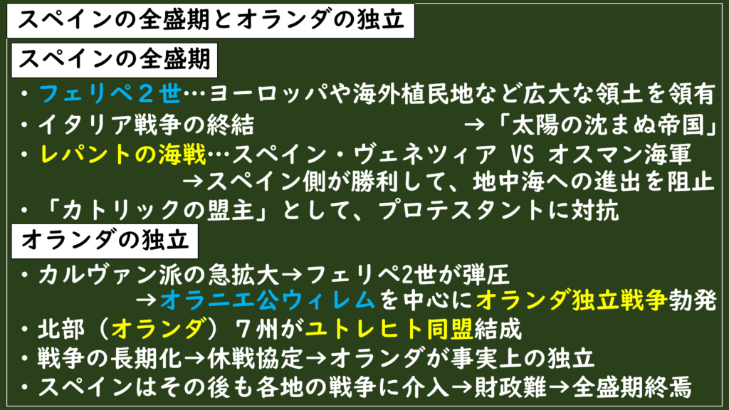 前回の[11-3.3]スペインの全盛期とオランダの独立で、オランダはスペインから事実上独立することになりましたよね。