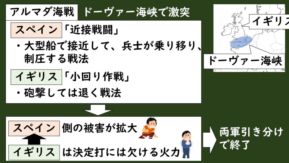 その後、スペインは陸上部隊と連携してイギリス上陸を計画しましたが、通信技術の限界で連絡が取れず、作戦は失敗に終わってしまいました。