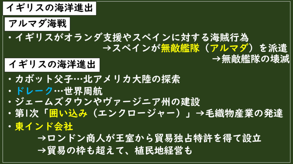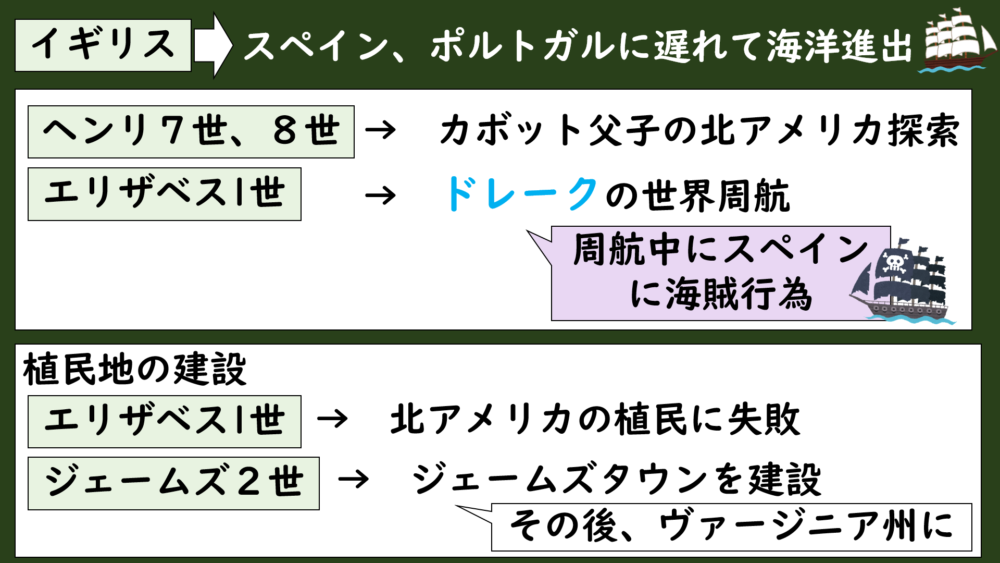 さきほども説明した通り、イギリスはスペインやポルトガルに大きく遅れながら、テューダー朝のもとで海洋進出に本格的に乗りだしていきます。
