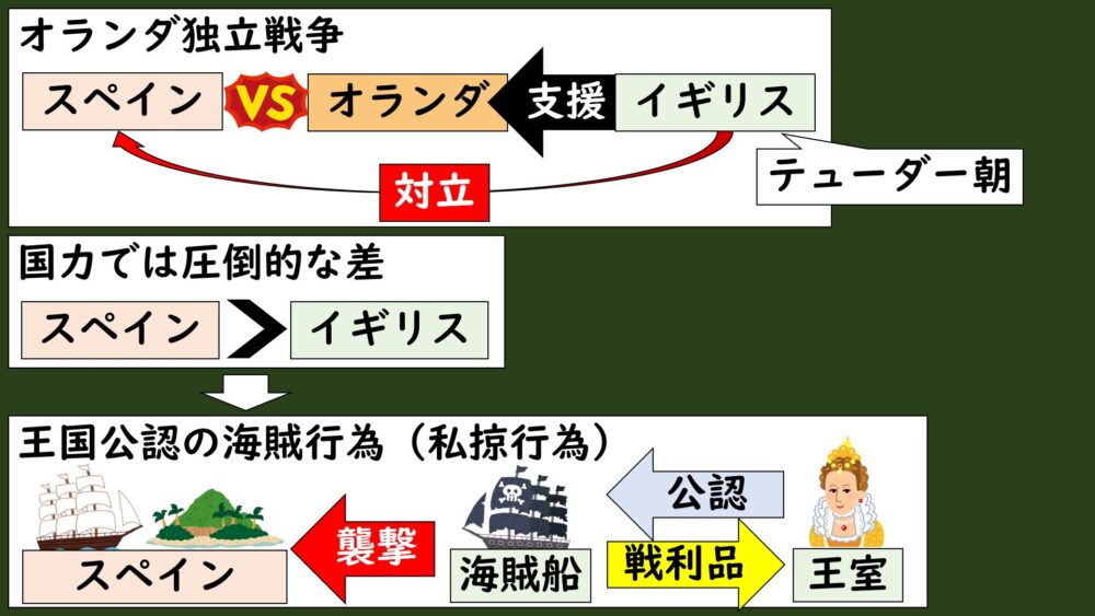 スペインと対立していたイギリスはまだ当時、海洋進出で広大な海外植民地を持っていたスペインに大きく出遅れていて、国家としては発展途上でした。