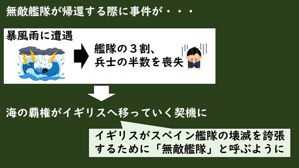 この時にイギリスはスペイン艦隊が壊滅したことを誇張するために、「無敵艦隊」と呼ぶようになったんですよね。
