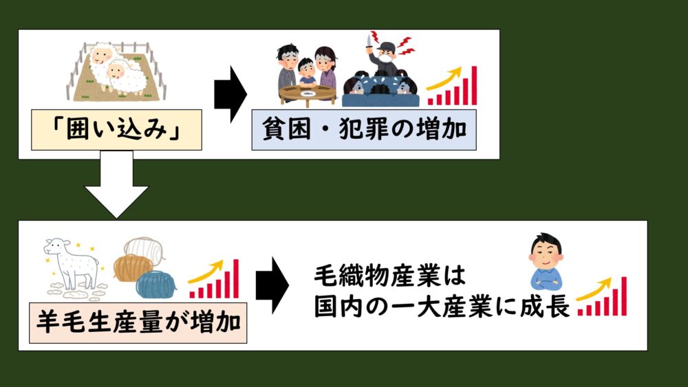 毛織物の輸出が増加し、羊毛の価値が高まったため、領主や地主はより多くの利益を求めて農民の土地を取り上げ、牧羊地へと転換したため。これによって農民は土地を失い、都市へ移住して工場労働者となり、イギリス社会は封建的な農村社会から資本主義的な労働社会へと変化していった。