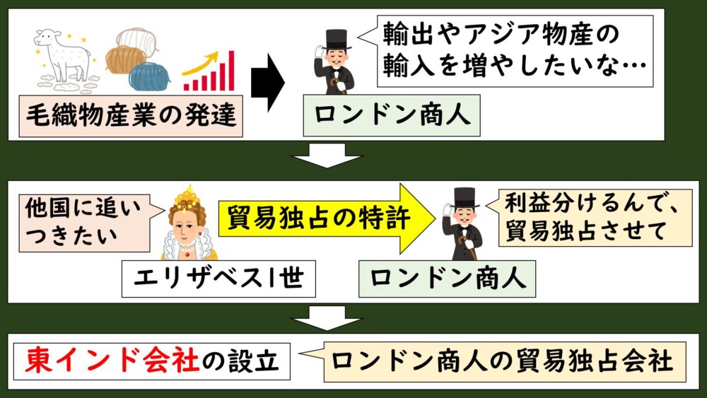 イギリス国内で毛織物産業が発達したことで、商人たちが毛織物の輸出経路の拡大や、それと引き換えに購入するアジア物産の輸入拡大を求めるようになります。