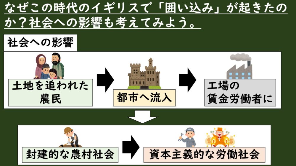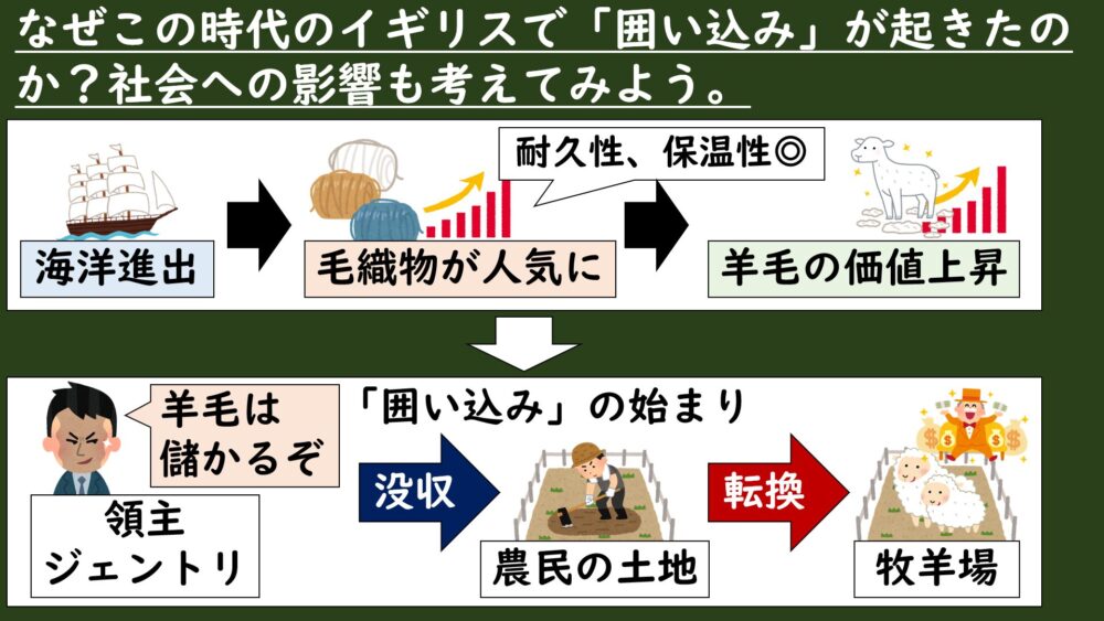 SQ:なぜこの時代のイギリスで「囲い込み」が起きたのか?社会への影響も考えてみよう。