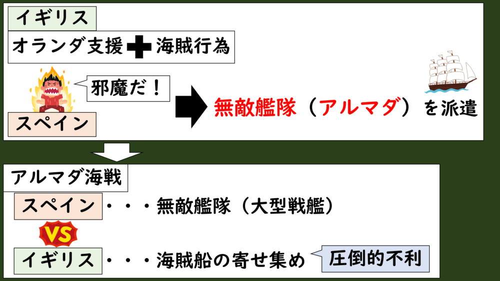 なので、当時のスペイン王フェリペ2世は、これに対抗するために、無敵艦隊(アルマダ)と呼ばれた強大なスペイン海軍をイギリスに派遣して、イギリスの制圧に乗り出しました。