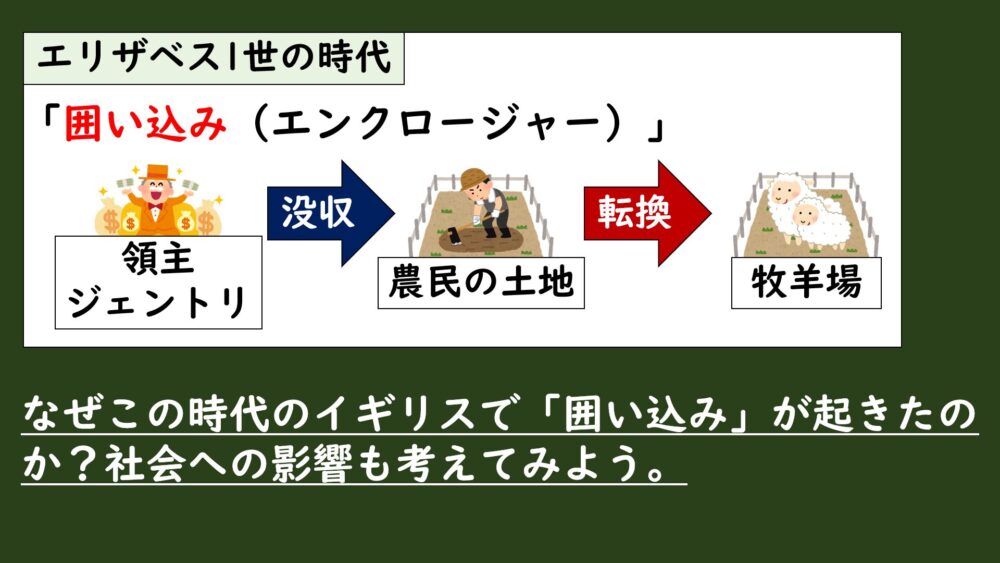 海洋進出が進んだエリザベス1世の時代に、イギリス国内では領主や地主(ジェントリ)が農民から土地を取り上げて、柵や石垣で囲って羊の牧場にしてしまう、「囲い込み(エンクロージャー)」と呼ばれる現象が起きていました。