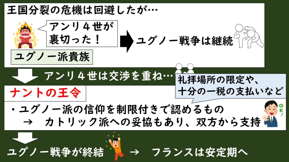 アンリ4世はこのユグノー戦争を終結させて、王国を安定させるために両派と交渉を重ねます。