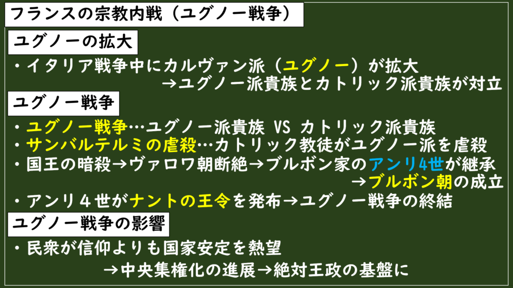 このユグノーがフランスで拡大していったことで、貴族たちの中でカトリック派とユグノー派との対立が次第に深刻になっていき、最終的に起こったのが宗教内戦であるユグノー戦争でした。