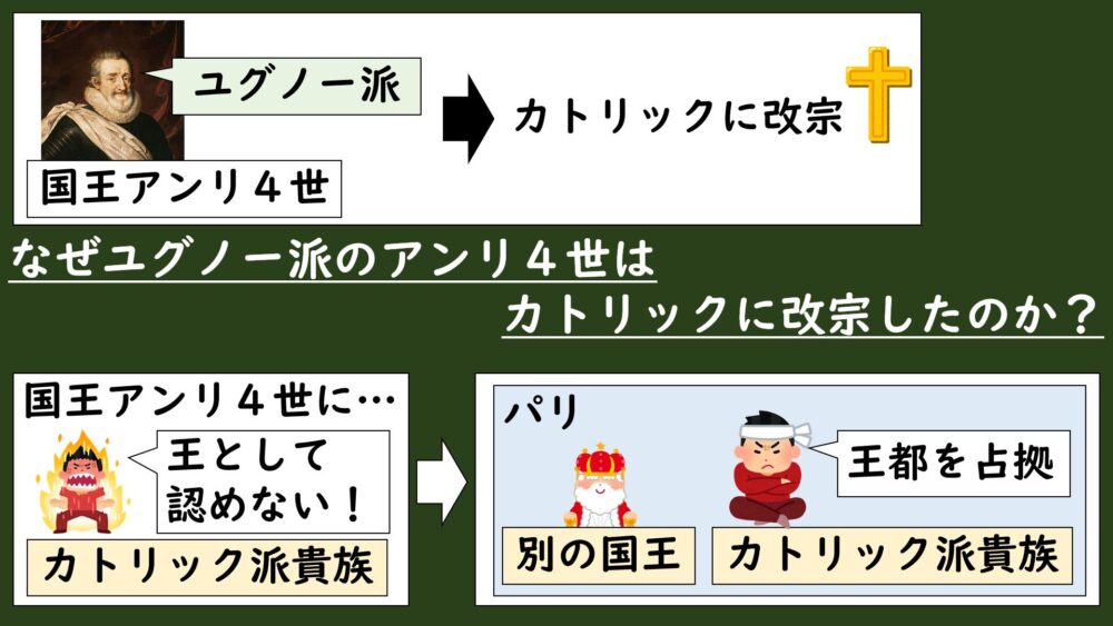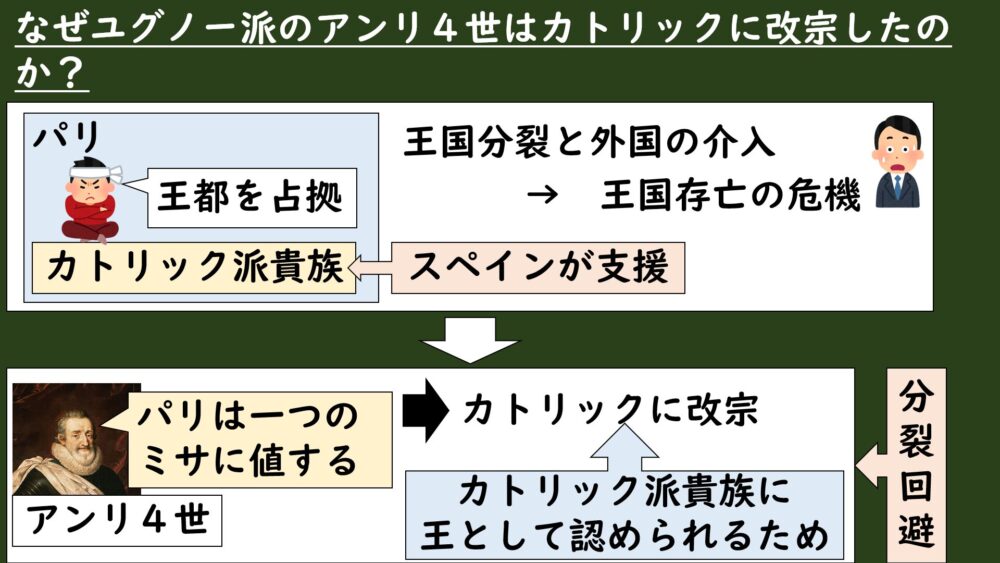 ユグノー派のアンリ4世は、フランスの分裂とスペインの介入による国家存亡の危機を乗り越えるため、カトリック派に国王として認められ王国を統一する目的でカトリックに改宗した。