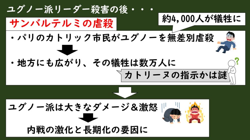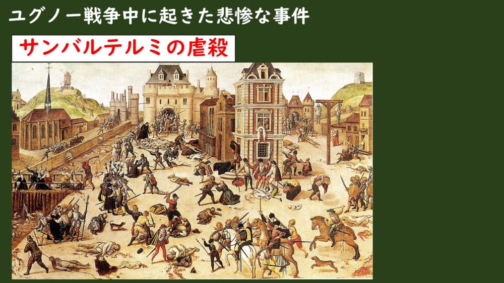 このサンバルテルミの虐殺によって、ユグノー派は大きなダメージを負うことになり、生き残ったユグノー派の怒りが増したことで内戦はさらに激化していくことになってしまいました。