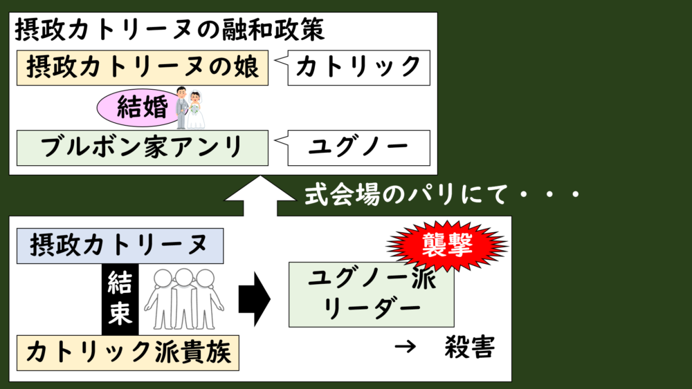 この事件は、摂政カトリーヌ=ド=メディシスがカトリック派の娘とユグノー派ブルボン家のアンリ(後の国王アンリ4世)を結婚させる計画をして、カトリック派とユグノー派の融和を目指したことから始まりました。