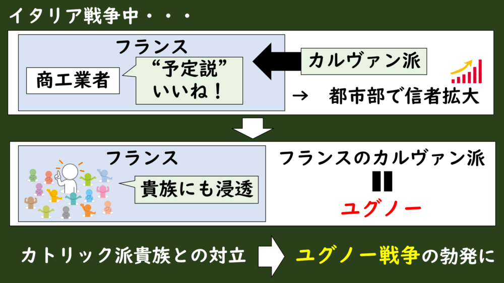 カルヴァンが唱えた「予定説」は、「勤勉な生活が神の救済の前提条件」であったことから、フランスでも商工業者に受け入れられて、カルヴァン派は都市部を中心に広がっていきました。
