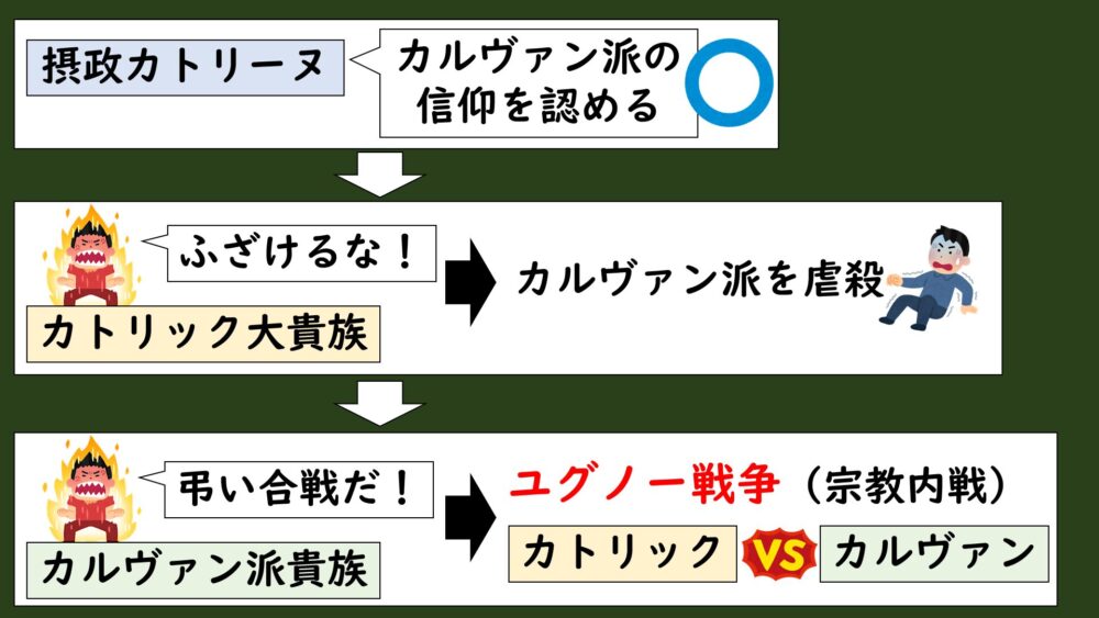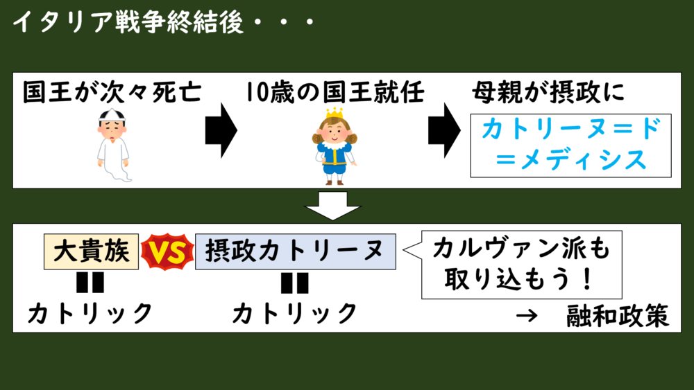実権を握ったカトリーヌ=ド=メディシスはカトリック教徒だったんですが、当時、王族を脅かすほどの強大な勢力を持つカトリック貴族に対抗するため、ユグノー派に協力的な姿勢を見せていたんです。