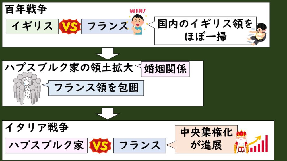 このイタリア戦争を通じて、フランスは国力を高めるために国王への中央集権化をおこない、常備軍を整えて、主権国家を成立させていくことになりました。