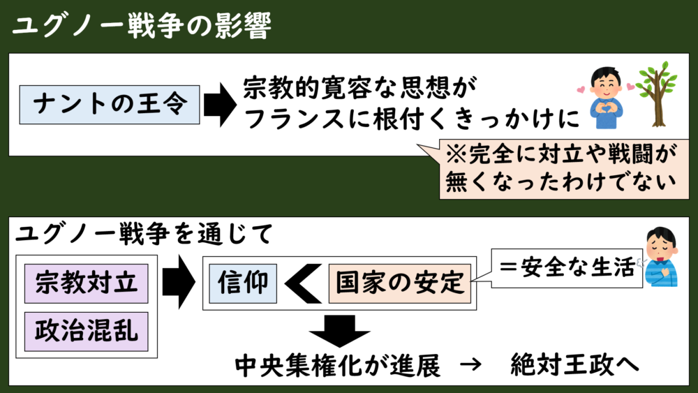 こうして、フランスはカトリックを国教としつつも、プロテスタント(カルヴァン派)の信仰の自由を認めて、国内の治安を安定させることに成功しました。