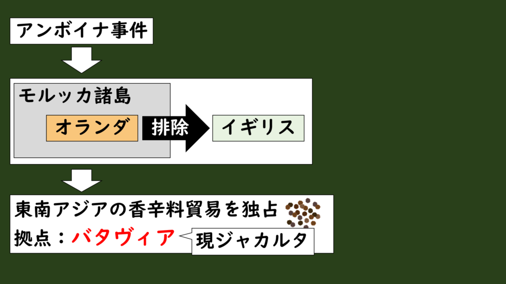 この事件を機に、オランダはイギリス勢力をモルッカ諸島から排除して、ジャワ島のバタヴィア(現在のジャカルタ)を拠点に、東南アジアの香辛料貿易を独占することになったんです。