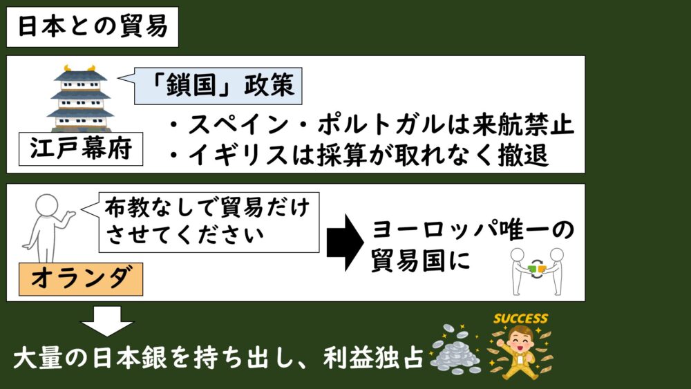 また、オランダは東南アジアだけでなく、日本(江戸時代)とも交易をおこなっていました。