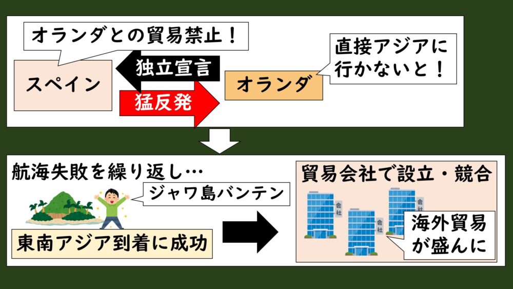 これによってポルトガルのリスボンなどの港が使えなくなってしまい、オランダ商人たちは香辛料などの取り引きをおこなうためには、自分たちで直接アジアに取りにいかなければならなくなったんです。