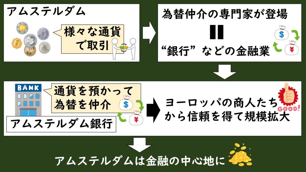 1609年に設立されたアムステルダム銀行では、各国の通貨を預かって為替の取り引きを仲介することで、ヨーロッパ中の商人から信用を得て頼りにされるようになります。