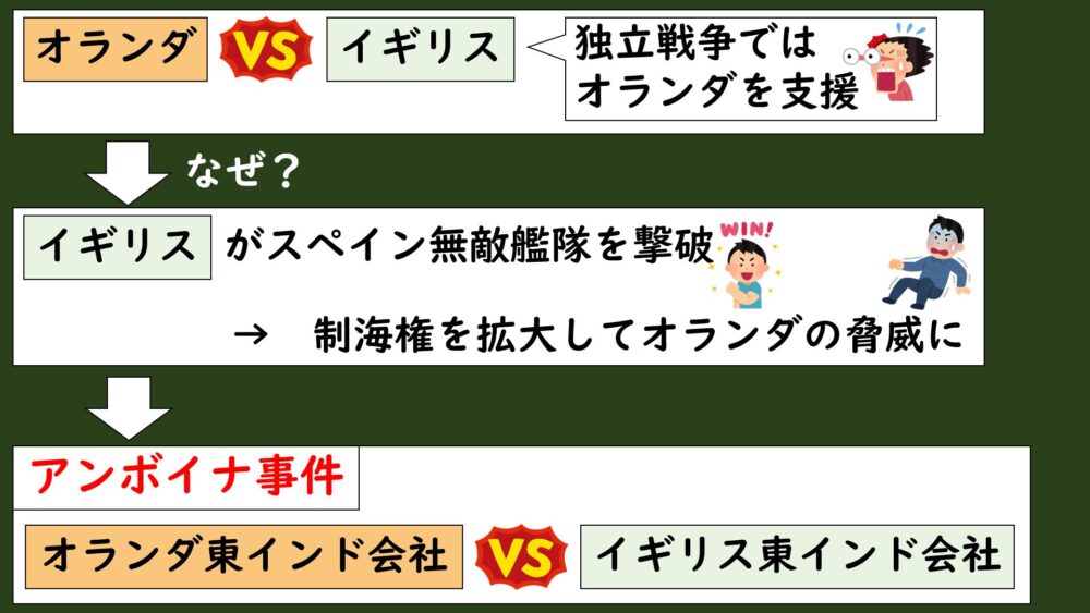 イギリスは当時、アルマダ海戦でスペインの無敵艦隊を破ったことで制海権を広げて、東インド会社を中心にアジアの海上交易で台頭して、オランダの勢力圏を脅かす存在になっていたんです。