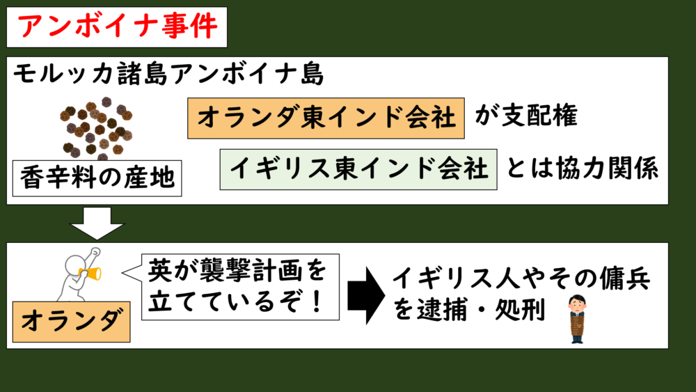アンボイナ事件は、現在のインドネシアのモルッカ諸島で起きたイギリスとオランダの緊張を一気に高めた出来事です。