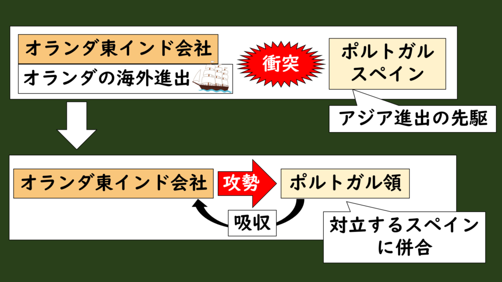 各地でポルトガル勢力を追い出していき、ポルトガルが持っていた貿易ルートや資源を次々と手中に収めていったんです。