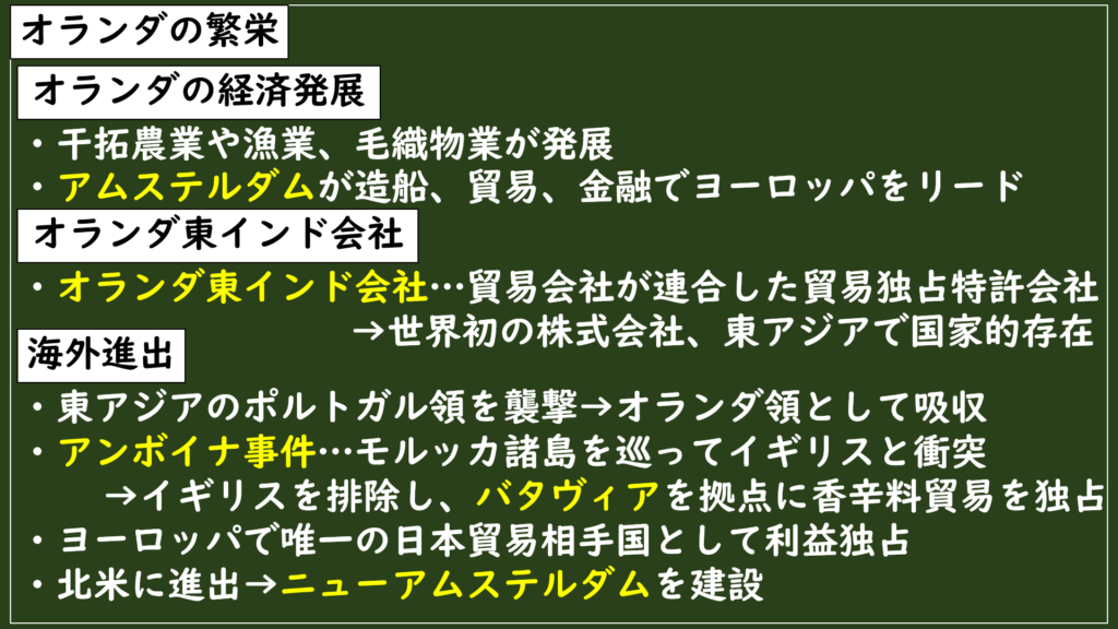 A:干拓農業や北海を活かした漁業、毛織物業などの基盤産業の発展に加え、アムステルダムを中心とする商業・金融の成長があったためである。また、世界初の株式会社であるオランダ東インド会社によってアジア貿易を独占し、積極的な海外進出を進めたことも、経済大国に成長した要因になった。
