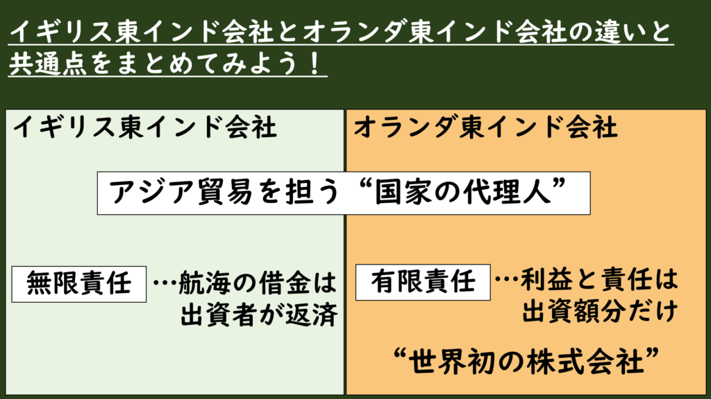 ではここで、イギリスとオランダの2つの東インド会社の特徴の違いと共通点についてまとめてみましょう。