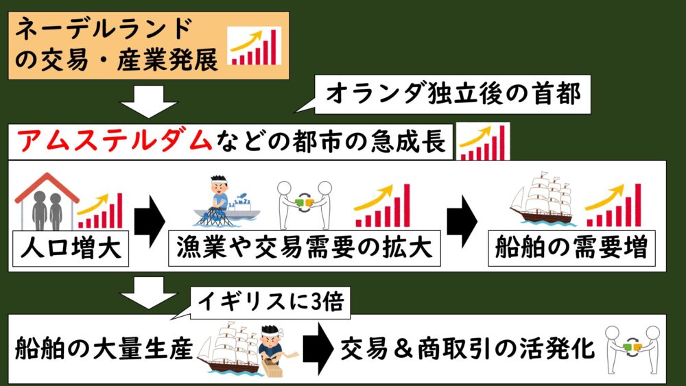 ネーデルランド北部にあたるオランダでは、こうした交易や産業の発展によって、独立後の首都となったアムステルダムを中心に、都市が急成長して商業活動が活発化していきました。