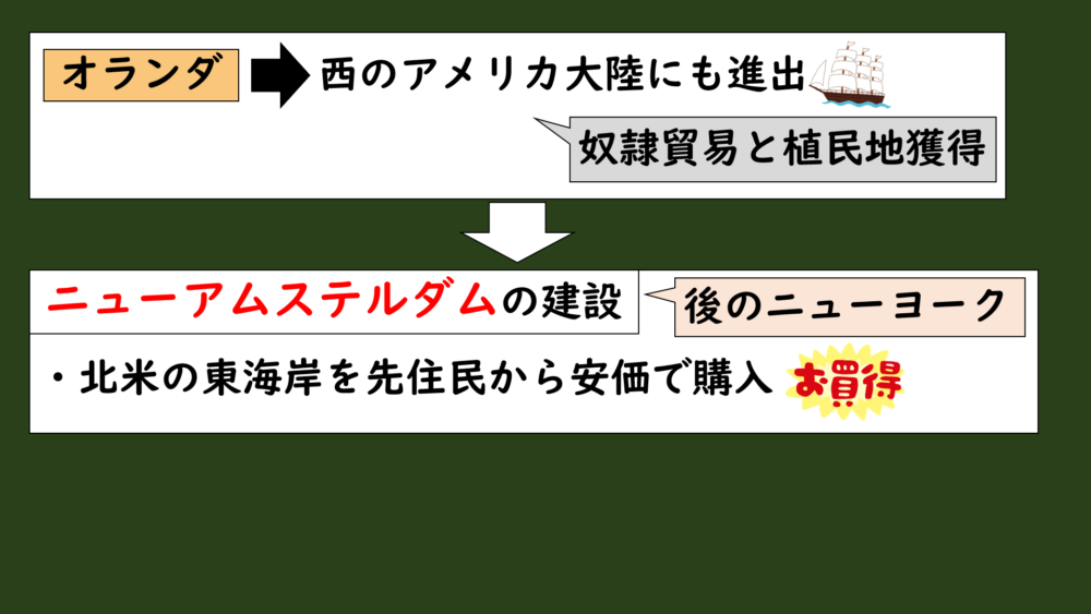 さらにオランダは、西側の大西洋の黒人奴隷貿易にも進出していき、アメリカ大陸の植民地の獲得にも乗り出していきました。