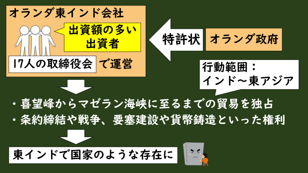 国から貿易独占の特許状を授かって、喜望峰からマゼラン海峡に至る広大な海域での貿易独占権を手にしていました。