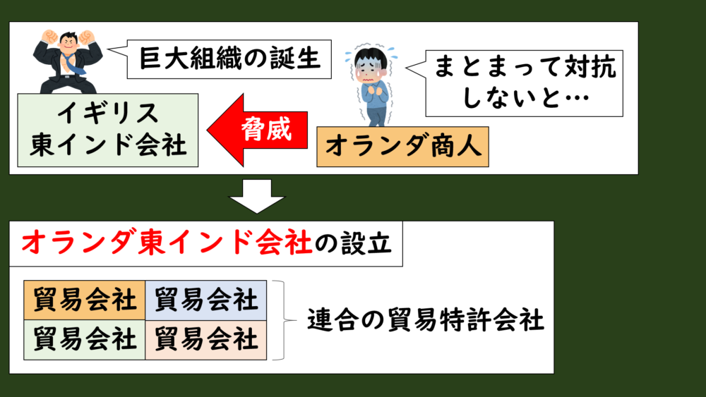 しかし、ここでイギリスで東インド会社という巨大組織が誕生したことで、オランダ商人はこの脅威に対抗するために、競合する会社たちを1つにまとめる必要に迫られました。