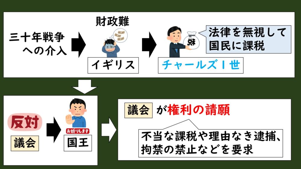 この事態に議会は、不当な課税や理由なき逮捕・拘禁の禁止などを国王に求めた「権利の請願」を突き付けて、王権を制限しようとしました。