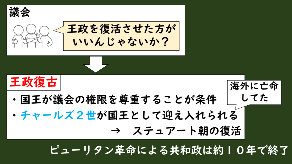 そして、チャールズ1世の息子で、当時オランダに亡命していたチャールズ2世を国王として迎え入れることになり、ステュアート朝による王政が復活(王政復古)することになりました。