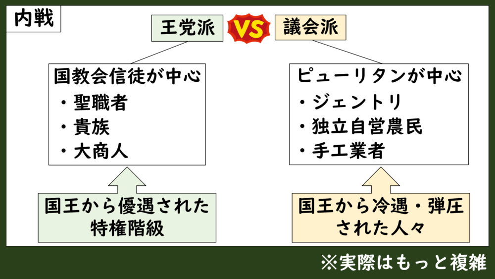 要は、議会派は国王に冷遇されたり弾圧されたピューリタン、王党派は国王から優遇された特権階級に大きく分かれて争われたわけです。