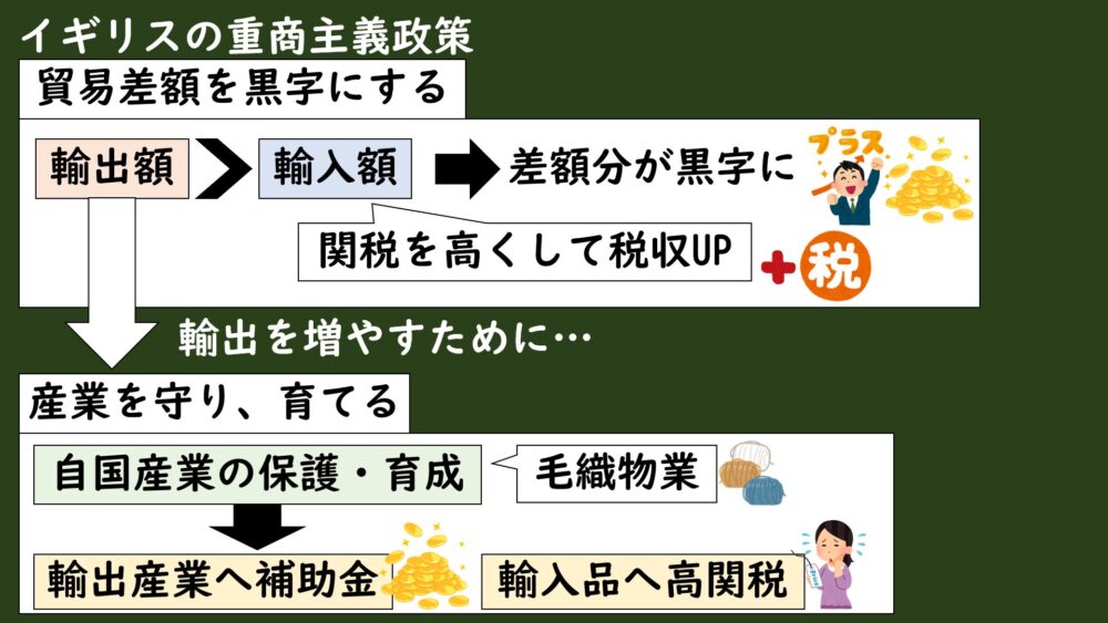 そこでイギリスは、自国の産業(特に毛織物業)を保護・育成する政策をとるようになります。