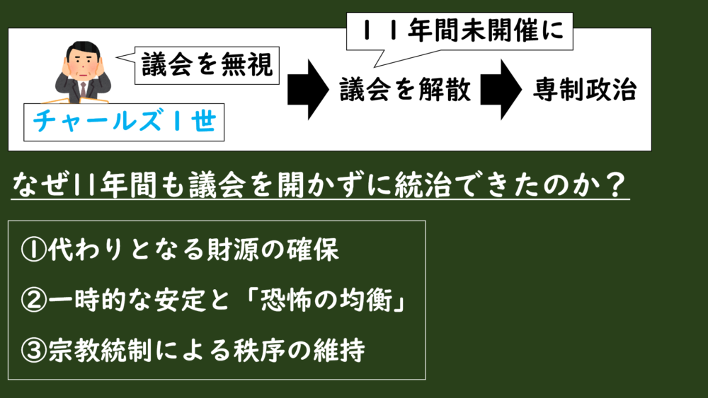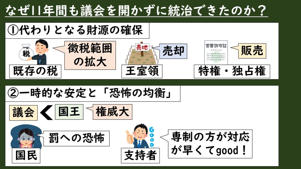 と、王の専制政治に対して、政策決定や問題への対応の速さに好感を持って支持していた議会勢力もいたので、11年もの専制を可能にしていたんです。