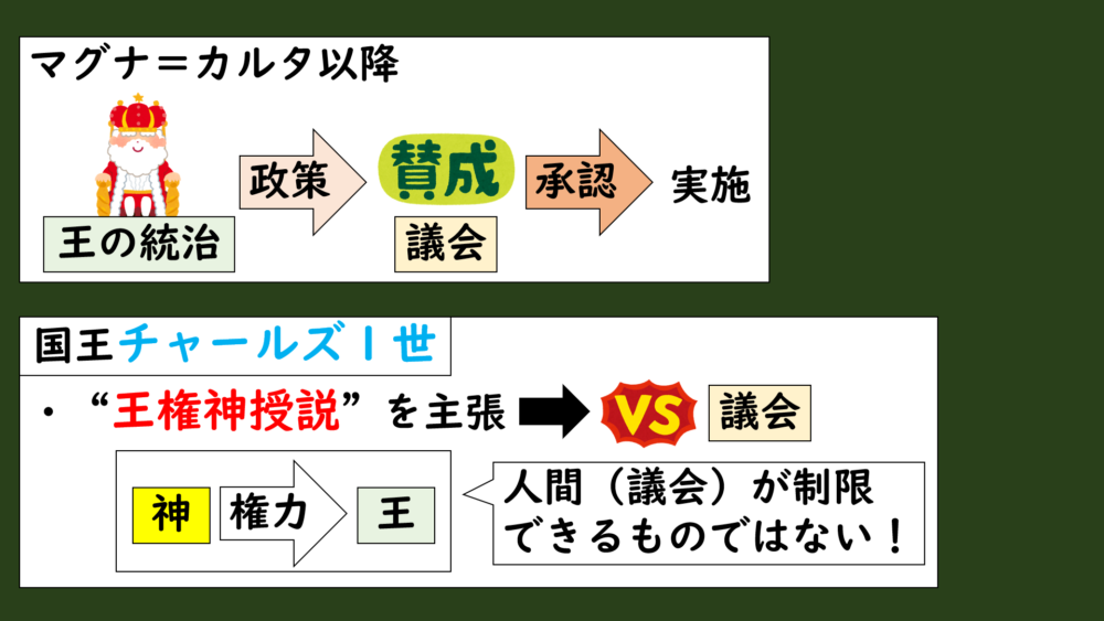 このチャールズ1世による「王権神授説」によって、王の権威は神から授けられたものであると主張し、王の権力を制限しようとする議会の動きと真っ向から対立することになりました。