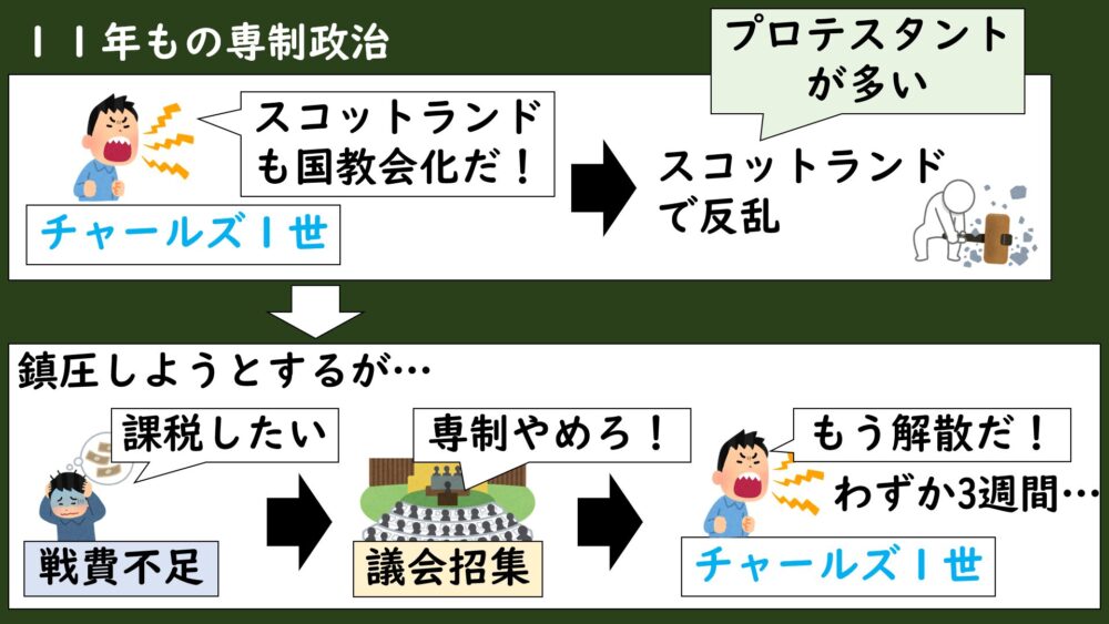 チャールズ1世は、このスコットランドでの反乱を鎮圧しようとしますが、戦費が足らなくなってしまったので、新しく課税するために、仕方なく11年ぶりに議会を招集することになったんです。