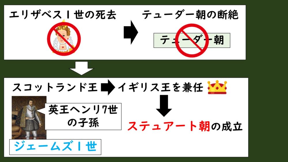 なので、新たにスコットランドからヘンリ7世の子孫であるステュアート家のジェームズ1世が国王として迎えられることになります。