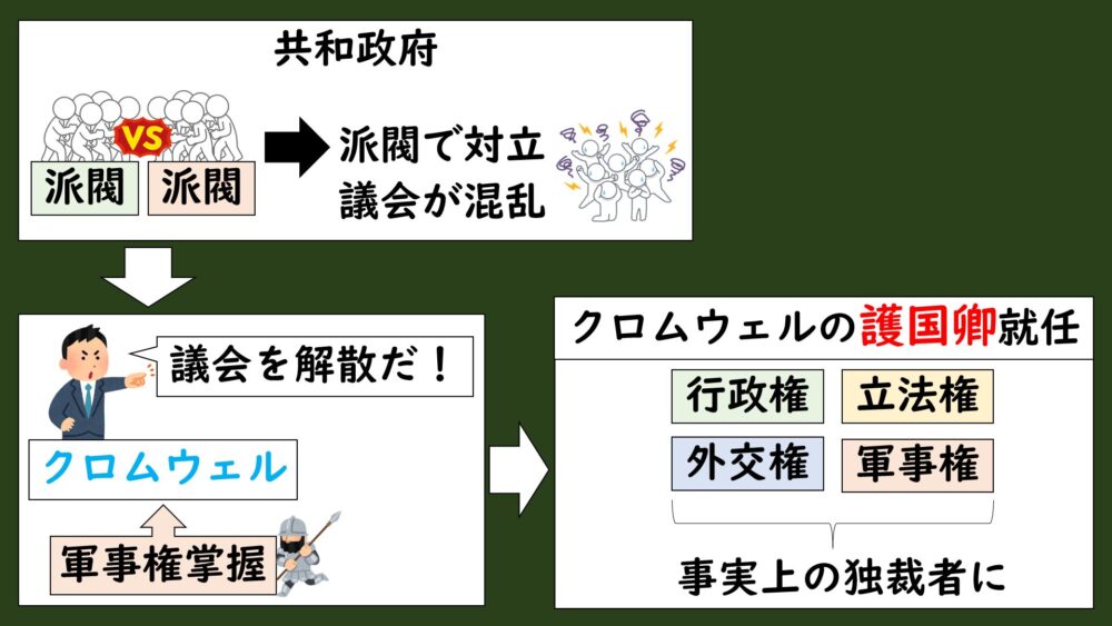 クロムウェルは議会を軍隊の圧力で解散してしまい、護国卿(ごこくきょう)という役職に就任してしまったんです。