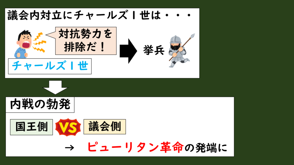 この議会内の対立をチャンスと捉えたチャールズ1世は、自ら兵を率いて国王を支持する勢力と組んで、王権を制限しようとする議会勢力を排除しようとします。