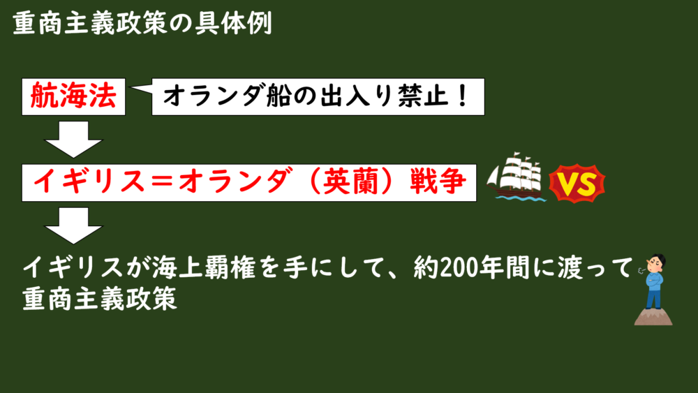 この航海法でオランダの中継交易を妨害したことで、3度にも渡るイギリス=オランダ(英蘭)戦争が起きましたが、その後、海上覇権を手に入れたイギリスは、その後約200年間に渡って、このような重商主義政策を続けていくことになりました。