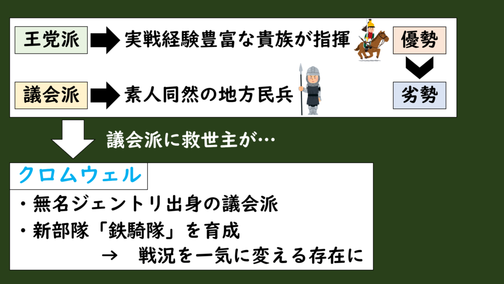 クロムウェルはもともと無名の下級のジェントリ出身でしたが、熱心なピューリタンで仕事もできる人だったので、議会派の中で指導者として頭角を現していきました。