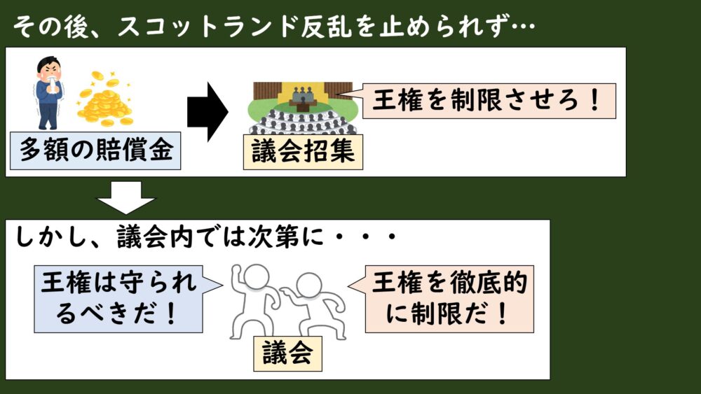 この間にスコットランドの反乱軍は勢いを増していき、反乱を止められなくなってしまったので、チャールズ1世は反乱軍に対して、多額の賠償金を支払うことになってしまいました。