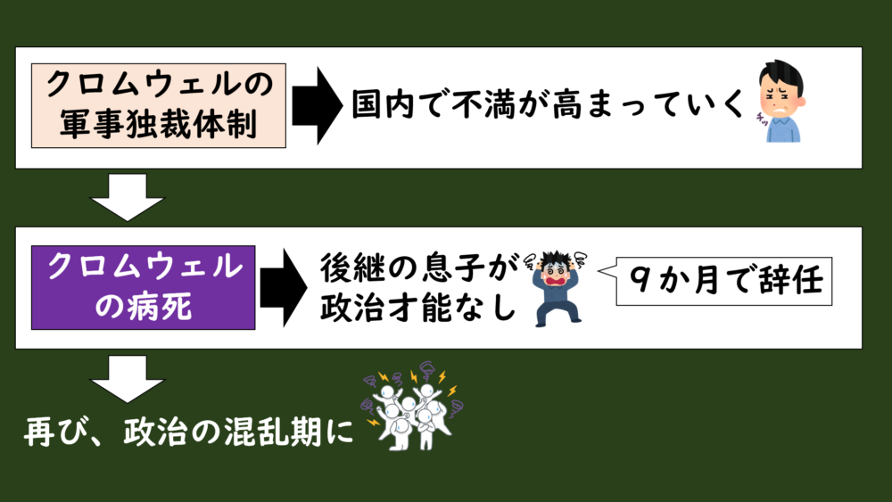 クロムウェルが病気によって亡くなってしまうと、息子が後を継ぎますが、政治家としての才能がなかったので、軍や議会をまとめることができずに、わずか9ヶ月で辞任してしまいます。