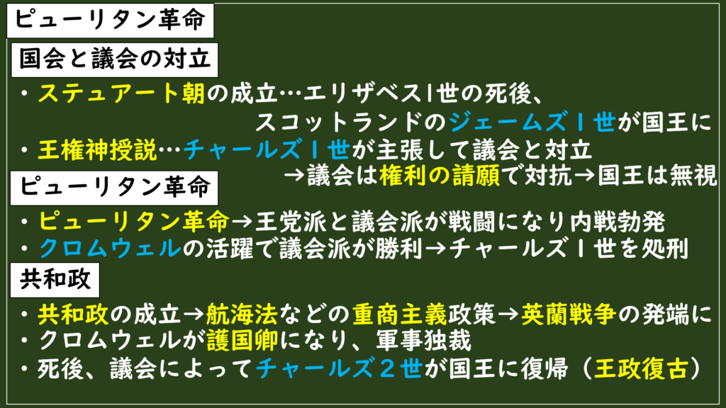 今回はイギリスで起きたピューリタン革命についてです。この革命はイギリス社会にどんな新しい秩序をもたらしたんでしょうか?