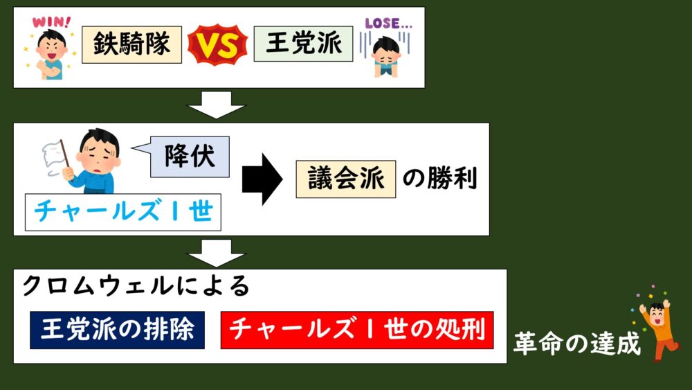 勝利した議会派のクロムウェルは、議会内の王党派を排除して、裁判を開いて国王チャールズ1世を処刑してしまい、ピューリタン革命は達成されることになったんです。