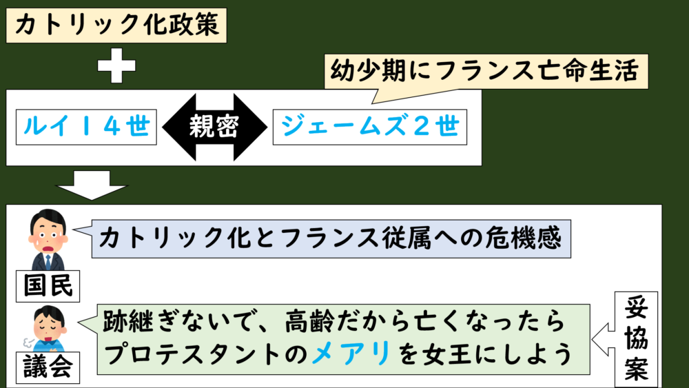 しかも、ジェームズ2世はフランスで亡命生活を送っていた過去から、カトリックのフランス王ルイ14世とも親密な関係を築いていて、国民の間でも疑惑がうわさされていました。