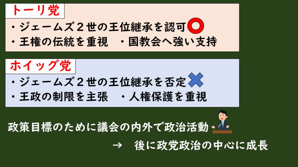トーリ党・・・ジェームズ2世の王位継承を合法と認めた議員たちで構成。王権などの伝統を重視、国教会を強く支持。